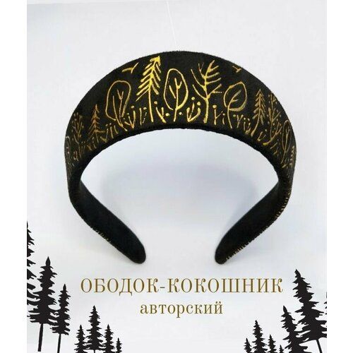 Полукруглый замшевый ободок-кокошник чёрного цвета с золотистый рисунком.