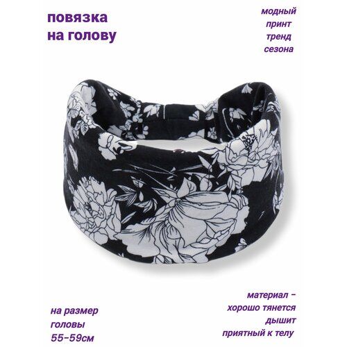 НАЙТИ ВЫГОДНЕЕ - Повязка на голову трикотажная, принт чёрная светлые цветы
