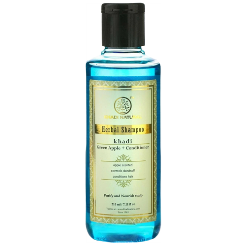 Кхади Натурал, Индия. Производство Khadi Natural, 210 мл Шампунь-кондиционер Зелёное Яблоко Khadi Natural - отличный тоник для волос, он предотвращает появление седины и устраняет перхоть, является натуральным моющим средством для волос. Основным компонентом шампуня является экстракт зелёного яблока, который имеет питательные и увлажняющие свойства, обогащён витаминно-минеральным комплексом и является натуральным кондиционером для волос. Натуральный шампунь имеет сбалансированный pH уровень и отлично подойдёт для ежедневного использования. Также шампунь прекрасное средство ухода за окрашенными или химически завитыми волосами.