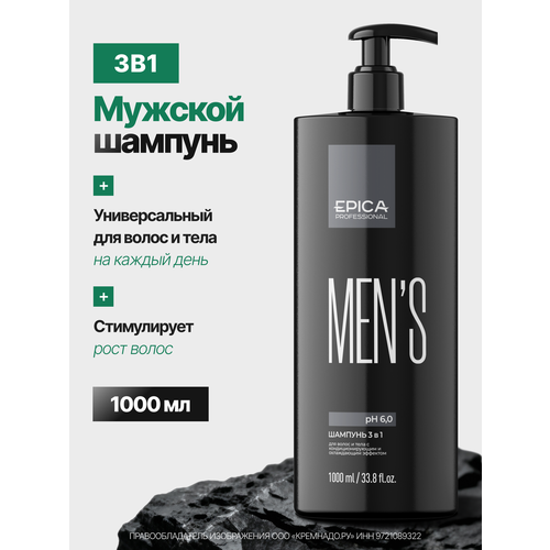 НАЙТИ ВЫГОДНЕЕ - EPICA Professional Шампунь мужской универсальный Men's 3 in 1 для волос и тела, 1000 мл 1000 мл 1 шт. с дозатором 1000 г
