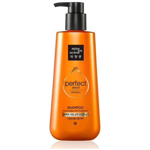 Питательный шампунь для поврежденных волос Mise en Scene Perfect Serum Original Shampoo создан на базе "коктейля" из 7 ценнейших масел, благодаря чему не только отлично очищает кожу головы от избытка кожного себума, но и ухаживает за длиной волос: окутывает каждый волосок, разглаживая кератиновые чешуйки и заполняя поврежденные участки; устраняет сухость и пушение; уменьшает ломкость; придает мягкость и здоровое сияние. Шампунь отличается свежим парфюмированным ароматом, который еще некоторое время остается на волосах, создавая неповторимый шлейф: Верхняя нота: цитрус, лаванда, зеленое яблоко. В сердце аромата: жасмин и роза. Конечная нота: морской бриз, пачули, ветивер, мускус. Шампунь вошел в ТОП лучших на Cosmo Beauty Awards 2016. Основные действующие компоненты: Масло арганы — действие масла направлено на глубокое питание и комплексный уход за волосами и кожей головы, восстановление целостности поврежденной структуры волос, укрепление волосяных луковиц, ускорение роста волос, лечение перхоти, раздражений и устранение других дискомфортных ощущений. Комплекс масел камелии, кокоса, абрикоса, оливы, марулы, жожоба оказывает смягчающее и восстанавливающее действие, помогает избавиться от сухости и ломкости, запечатать секущиеся кончики. Маточное молочко обладает исключительными регенерирующими свойствами, прекрасно питает кожу головы и волосы, предотвращает выпадение волос. Гидролат розы защищают волосы от термического воздействия. Гидролизат протеина устриц разглаживает волосы, придает сияние, заполняет поврежденные участки. Подходит для сухих, ломких, пушащихся, поврежденных волос. Способ применения: Нанесите шампунь на влажные волосы, мягко помассируйте кожу головы, смойте водой. Для усиления эффекта рекомендуется использовать в паре с кондиционером из этой же серии.