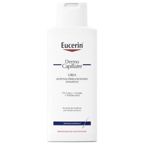 Шампунь успокаивающий EUCERIN Dermo Capillaire, для сухой и зудящей кожи головы, 250 млУспокаивающий шампунь DERMOCAPILLAIRE разработан специально для сухой и зудящей кожи головы. Формула шампуня содержит: комбинацию 5% мочевины и молочной кислоты, которые предотвращают потерю влаги и увлажняют кожу; Полидоканол, который уменьшает зуд. Он обогащен мочевиной и лактатом - двумя натуральными увлажняющими факторами, которые вырабатывает здоровая кожа, для питания и ухода, необходимого сухой зудящей коже головы. При совместном применении с успокаивающим тоником для кожи головы DERMOCAPILLAIRE шампунь облегчает зуд и уменьшает сухость, придает волосам здоровый блеск, делает их мягкими и послушными. Этот шампунь идеально подходит людям с псориазом и атопическим дерматитом. Уменьшает сухость, бережно очищая чувствительную кожу головы. Успокаивает кожу головы, улучшая ее состояние. Способ применения: Нанести на влажную кожу головы и волосы, вспенить и тщательно смыть. При необходимости повторить. Подходит для ежедневного применения.