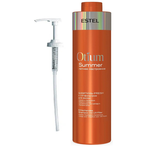OTIUM SUMMER Шампунь-fresh с UV-фильтром для волос, 1000 мл - мягко очищает, освежает и увлажняет кожу головы. Протеины шёлка кондиционируют волосы, придают им гладкость. Соки апельсина и грейпфрута богатые витаминами оказывают антиоксидантное действие и увлажняют волосы и кожу головы.\nПротеины шёлка\nСок апельсина\nСок грейпфрута\nПрименение: нанести на влажные волосы, помассировать, смыть. Повторить при необходимости