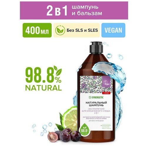 Бессульфатный шампунь SYNERGETIC «Экстрамягкий для ежедневного ухода 2 в 1» — эффективное средство для очищения кожи головы и всех типов волос — более чем на 98% состоит из натуральных компонентов.