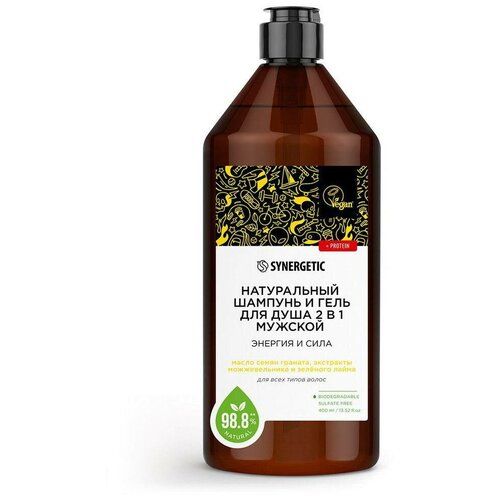 Натуральный бессульфатный шампунь и гель для душа 2 в 1 мужской SYNERGETIC "Энергия и сила" - эффективное средство для очищения тела, кожи головы и всех типов волос, более чем на 98% состоящее из натуральных компонентов. Бессульфатный шампунь и гель для душа "2 в 1" обеспечивает деликатное очищение и эффективный уход. Формула с протеином восстанавливает поврежденные волосы, укрепляет и оздоравливает их структуру. Комплекс масел гранатовой косточки и макадамии, который оказывает восстанавливающее действие. Инновационные компоненты шампуня укрепляют волосы и стимулируют формирование кератиновых волокон. Экстракты сандала, можжевельника и зеленого кофе активизируют волосяные луковицы и стимулируют рост волос. Мультифункциональный компонент натурального происхождения софоролипид мягко очищает кожу головы и сохраняет естественный микробиом кожи. Инновационный увлажняющий комплекс усиливает барьерные свойства кожи и обеспечивает до 72 часов глубокого увлажнения. Физиологичный уровень pH 5,5 устраняет сухость кожи головы и гарантирует безопасность при частом использовании средства даже для чувствительной кожи. Натуральный шампунь не содержит SLS, SLES, парабенов, силиконов, минеральных масел и красителей, а также компонентов животного происхождения, не тестируется на животных и сертифицирован британской организацией The Vegan Society. Знак Vegan - мировой стандарт этичной продукции. Биоразлагаемые компоненты шампуня безопасны для природы и человека и не наносят вред микрофлоре септических установок.