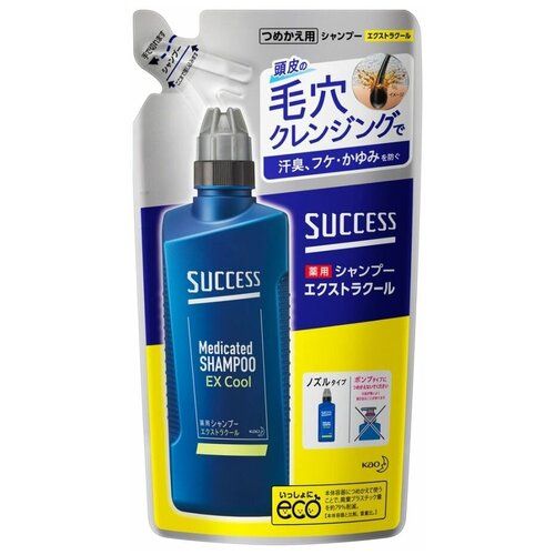 KAO Success Шампунь для мужчин, с лечебными ингредиентами и экстрактом эвкалипта, запасной блок, 320мл. Освежающий шампунь для мужчин с лечебными ингредиентами КАО Success Extra Cool создан для мужчин, желающих придать своим волосам ухоженный, здоровый вид и натуральный блеск от корней до самых кончиков. Шампунь превосходно очищает волосы от загрязнений и жира. Компенсирует потерю естественной влаги, устраняет шелушение и зуд. Эффективно борется с перхотью, нормализует работу сальных желез и предотвращает появление неприятного запаха. Натуральный экстракт эвкалипта в составе шампуня прекрасно увлажняет кожу. Шампунь с прекрасным пенообразованием и очищающей способностью не только отвечает за гигиену волос и кожи головы, но и отлично кондиционирует. Наполняет волосы жизненной силой и энергией, придавая им необыкновенную мягкость, блеск, здоровый вид. Ментол надолго оставляет ощущение свежести после мытья. Без силикона. Состав
