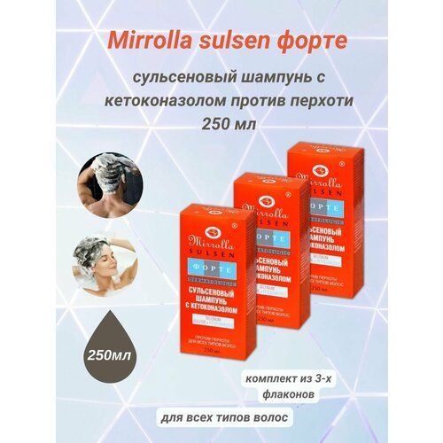 Способ применения: намочить волосы. Нанести небольшое количество шампуня и распределить по всей длине волос. Вспенить и массировать в течение 2-3 минут. Смыть большим количеством воды. Использовать через день в течение 4-6 недель, после чего перейти на применение дерматологически мягкого шампуня мirrolla sulsen mite еще в течение 1,5-2 мес. Повторять курс по необходимости. Для усиления эффекта рекомендуется применять вместе с пастой mirrolla sulsen forte с кетоконазолом.