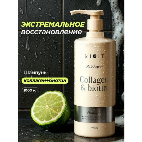 Миксит Встречайте нашу новую линейку для волос – Hair Expert. Она создана экспертами специально для ежедневного и салонного ухода, не содержит вредных ингредиентов, силиконов и парабенов. Пришло время вернуть вашим волосам исключительную красоту и здоровье с помощью профессионального шампуня для восстановления сильно поврежденных волос с эффектом ламинирования 1000 мл Shampoo Collagen & Biotin нанесите небольшое количество на мокрые волосы во время принятия душа или ванны, массируйте нежно кожу головы, чтобы обеспечить глубокое проникновение питательных веществ, и тщательно смойте водой.