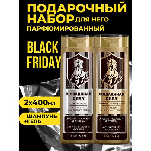 НАЙТИ ВЫГОДНЕЕ - Лошадиная Сила Подарочный набор мужской с маслом сандалового древа MEN бьюти бокс шампунь против выпадения волос + парфюмерный гель для душа «Аромат Роскоши и Успеха» 400*400 мл.