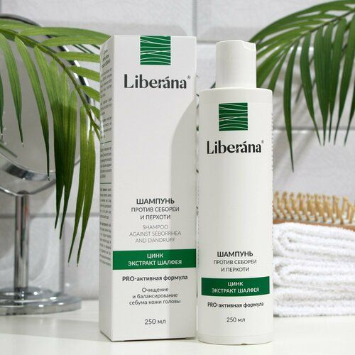 Артикул: 1785-908. Объем: 250 мл, Вес: 301 гр, Для кого: Для женщины, Тип волос: Для всех типов, Размер упаковки: 5.5 x 19.5 x 5.5 см, Температурное ограничение: Нет, Вид шампуня: Жидкий, Эффект: От перхоти. Шампунь против себореи и перхоти LIBERANA интенсивно очищает и нормализует работу сальных желез, способствует балансу себума. Цинк – эффективен в борьбе с перхотью, способствует устранению себореи. Экстракт шалфея – питает, укрепляет, придает мягкость и эластичность безжизненным и истонченным волосам. Подходит для ежедневного применения. Для наилучшего результата рекомендуется использовать в паре бальзамом-кондиционером для мягкости и эластичности волос LIBERANA. Способ употребления: нанесите небольшое количество шампуня на увлажненную кожу головы и взбейте в пену, далее разнесите пену по всей длине волос, тщательно промойте водой. Меры предосторожности: избегайте попадания шампуня в глаза, в случае попадания промойте большим количеством воды. Не использовать на поврежденной или раздраженной коже. Возможна индивидуальная непереносимость отдельных компонентов. Состав: Aqua, Sodium Laureth Sulfate, Cocamidopropyl Betaine, Sodium Cocoamphoacetate, Glycerin, Sodium Chloride, Parfum, Citric Acid, Polyquaternium-10, Zinc PCA (цинк), Propylene Glycol, Salvia Officinalis Extract (экстракт шалфея), Mentha Piperita Oil, Disodium EDTA, Methylchloroisothiazolinone, Methylisothiazolinone, Butylphenyl Methylpropional.