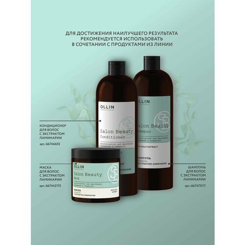 Шампунь для волос с экстрактом ламинарии SALON BEAUTY OLLIN PROFESSIONAL 1000 мл– это эффективное средство для очищения кожи головы. Профессиональная линия средств для волос SALON BEAUTY - это идеальное сочетание популярных superfood компонентов, которые работают в трех ключевых направлениях по уходу за волосами. Шампунь для увлажнения и разглаживания волос с экстрактом ламинарии мягко очищает кожу головы и волосы и обеспечивает деликатный антиоксидантный уход. Серия продуктов с ламинарией заметно улучшает состояние волос благодаря целому комплексу микроэлементов. Активный состав интенсивно увлажняет волосы и кожу головы, придает прядям безупречную гладкость и сияющий блеск, а также эффективно устраняет ломкость и сечение кончиков. Экстракт ламинарии нормализует работу сальных желез, насыщает волосы влагой и полезными микроэлементами, поддерживая гидробаланс на поверхности кожи головы. Шампунь делает волосы более гладкими и упругими и подходит для всех типов волос. Профессиональный шампунь олин эффективно воздействует на пористые, поврежденные, осветленные и обесцвеченные волосы. Olin shampoo шампунь для волос увлажняет и делает их мягкими и блестящими. Шампунь косметика для волос Ollin уход подходит для ежедневного применения. Шампунь оллин деликатно очищает, эффективно ухаживает за волосами и защищает кожу головы. Олин профессиональный уходовый шампунь для волос эффективно увлажняет волосы и придает им здоровое сияние, не утяжеляя. Способ применения: нанести шампунь на влажные волосы, вспенить массажными движениями. Смыть водой. Для достижения наилучшего результата рекомендуем использовать в сочетании с другими продуктами линейки.