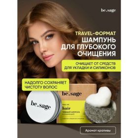 Твердый шампунь для глубокого очищения от бренда «be.sage» - хороший выбор для ухода за склонными к жирности и жирными волосами Полностью натуральная питательная формула с приятным травяным ароматом содержит 100% активных ингредиентов. Экстракт крапивы и английская соль эффективно удаляют излишки кожного сала и загрязнений, а календула и шалфей помогают напитать волосы и сделать их более гладкими. Шампунь подходит для использования в качестве средства для глубокой очистки волос от средств для укладки и силиконов, не пересушивает кожу головы. Уходовый косметический продукт деликатно очищает локоны и кожу головы. Экстракт крапивы и английская соль эффективно удаляют излишки кожного сала и загрязнений, а календула и шалфей помогают напитать волосы и сделать их более гладкими. Шампунь подходит для использования в качестве средства для глубокой очистки волос от средств для укладки и силиконов, не пересушивает кожу головы. Средство понравится взрослым женщинам и мужчинам, девушкам и юношам — подросткам. Оно имеет pH 5.0-6.0 и подходит для ежедневного использования. Натуральная формула укрепляет волосяные луковицы, предотвращая выпадение волос. Органический состав без консервантов, SLS и парабенов не утяжеляет локоны, делая их объемными, блестящими и красивыми. Он способствует бережной очистке и укреплению волос. Это хороший выбор для мытья головы от жирных корней. Шампунь в твердом формате удобно брать с собой в путешествия и командировки или на тренировки. Он обеспечит глубокое увлажнение и питание волос и кожи головы. Благодаря отсутствию воды в составе средство долго хранится и не содержит вредных компонентов. Продукт, созданный профессиональными косметологами, подходит для ухода за всеми типами мужских и женских волос. Он хорошо очищает густые и тонкие, непослушные и склонные к пушистости локоны.