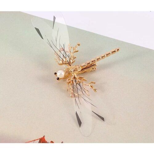 Фигурка стрекозы, украшающая заколку, выполнена из прозрачного пластика, что придает ей легкость и воздушность. Голова стрекозы увенчана небольшой жемчужной бусиной, что добавляет изысканности и элегантности.