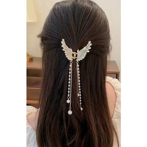 НАЙТИ ВЫГОДНЕЕ - Заколка -краб. Бабочка со стразами и жемчужными (имитация) подвесками. Цвет Золото