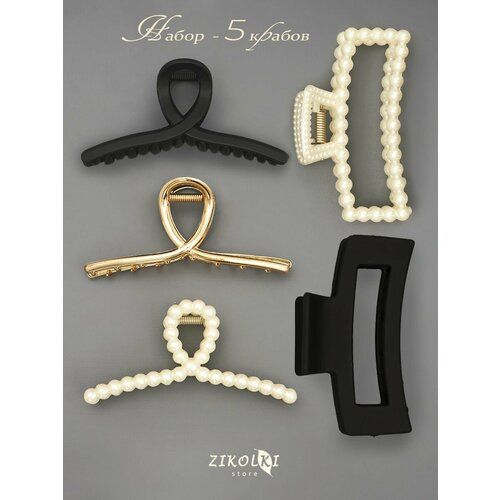 Стильные заколки - крабики среднего, большого размера в наборе из пяти штук от Zikolki Store - это практичное приобретение для себя и хороший подарок для родных или подруг. Комплект включает зажимы разной формы и цвета, в том числе матового черного с покрытием софт-тач и близкого к молочному белого, жемчужного и золотистого. У нас есть крабы из пластика и каучука с приятным на ощупь матовым покрытием Soft touch, металлического материала под золото, в том числе украшенные мелкими жемчужинами с перламутровым оттенком. Модные аксессуары отличаются крепким фиксатором - зажимом для надежной фиксации на голове. Красивые заколки удобны для создания стильной прически на длинных или коротких прядях, подходят, в том числе для тонких и волнистых волос, выступают изысканной бижутерией для украшения образа. Набор из 5 разноцветных крабиков, в том числе с маленьким жемчугом - это полезная покупка для девушки - подростка или женщины, которые выбирают изящные заколки для волос, милый сюрприз для маленькой девочки.
