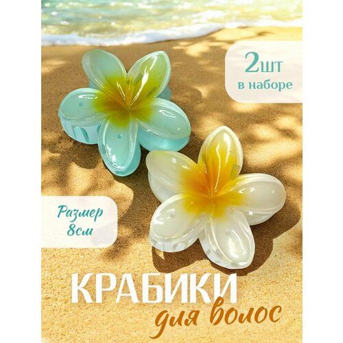 Дизайн и цвета: Крабик выполнен в форме гавайского цветка Франжипани, что придает ему особую изюминку. В комплекте идут 2 заколки ярких цветов, которые подойдут для любого образа и настроения.