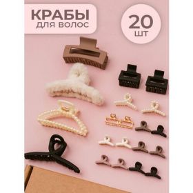 Набор из 20 маленьких и больших красивых и стильных крабиков для волос - идеальный выбор для создания разнообразных причесок. В комплекте вы найдёте большую и маленькие заколки в чёрном матовом цвете из каучука с приятным покрытием. Модели коллекции с крупными и небольшими перламутровыми бусинами выглядят стильно и элегантно. В наборе также присутствует красивый краб из металла в золотом цвете, жемчужные заколки и трендовая меховая пушистая заколка, коричневый краб заолка для волос отлично подходящие для праздничных и вечерних укладок. Металлические и пластиковые зажимы имеют крупную пружинку-фиксатор, надёжно держат любые волосы и подходят для различных типов волос. Все аксессуары для волос выполнены из высококачественных материалов, комфортны в носке и не давят на голову. Универсальный размер делает их подходящими для всех. Этот набор красивых заколок будет отличным подарком для дочери, жены или подруги. Идеальны для укладки в школу, создания красивых причесок на выпускной или свадьбу, а также для повседневного использования. Отличный подарочный набор на 8 марта для женщин.