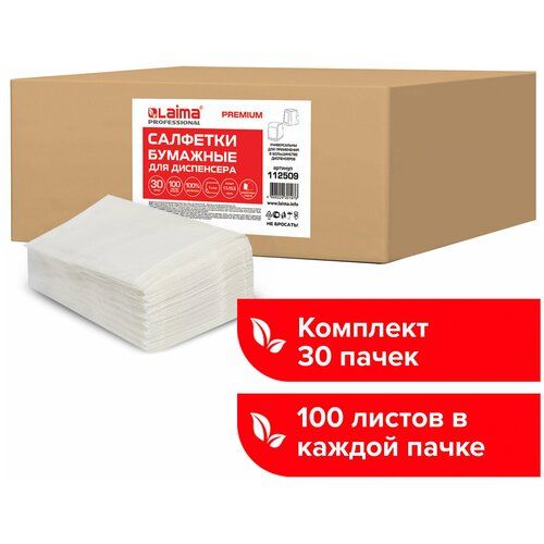 НАЙТИ ВЫГОДНЕЕ - Салфетки бумажные для диспенсера, LAIMA (N2) PREMIUM, 1-слойные, комплект 30 пачек по 100 шт, 17x15,5 см, белые, 112509