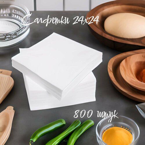 Салфетки бумажные 800 шт, 24х24 см (8 упаковок по 100 шт) однослойные, белые, изготовлены из 100% целлюлозы, что гарантирует их прочность и долговечность.