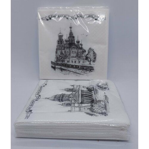 Набор из двух пачек сувенирных салфеток "Исаакий, Спас", черная графика, станет отличным подарком для любителей Санкт-Петербурга и его достопримечательностей.