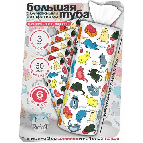 НАЙТИ ВЫГОДНЕЕ - Набор Салфетки бумажные в тубе ОЗОРНЫЕ КОТИКИ, 3 слоя, 50 шт х 6 уп