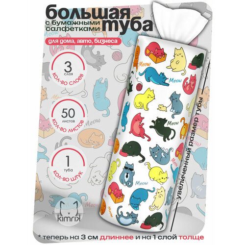 НАЙТИ ВЫГОДНЕЕ - Салфетки бумажные в тубе ОЗОРНЫЕ КОТИКИ, 3 слоя, 50 шт/уп