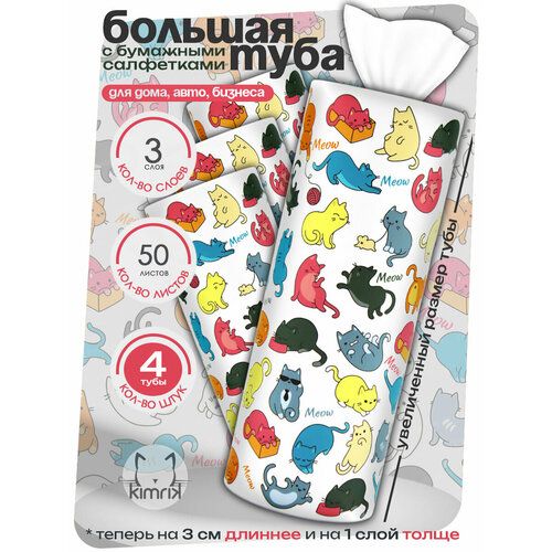 НАЙТИ ВЫГОДНЕЕ - Набор Салфетки бумажные в тубе ОЗОРНЫЕ КОТИКИ, 3 слоя, 50 шт х 4 уп