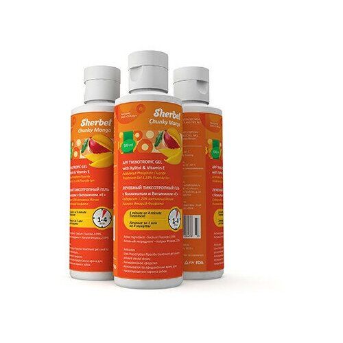 Гель Sherbet APF со вкусом свежего манго обычно используется на стоматологическом приеме для предотвращения заболевания кариесом и для снижения чувствительности зубов на температурные (холод, тепло) и химические раздражители (кислое, сладкое). Содержание ионов фторида - 1.23%(12 300ppm) с показателем pH 3.0. Продукт особенно рекомендован для людей, находящихся в группе риска заболевания кариесом, а также в ситуациях с недостаточным контролем за гигиеной полости рта. В ассортименте имеется специальная бесцветная форма, которая идеально подходит для применения после отбеливания зубов и у людей, страдающих аллергией на красители. Также АПФ-гель прекрасно подходит в качестве реминерализующей терапии после ортодонтического лечения. АПФ-составы чрезвычайно эффективны за счет закисленности, ионы фтора действуют быстрее и проникают глубже, запечатывая дентинные канальцы и снижая проницаемость эмали для раздражителей и патогенных микроорганизмов, вызывающих образование кариеса. Обладает свойством тиксотропности – предотвращает затекание материала в гортань пациента. Sherbet уникален благодаря содержанию ксилита, который снижает адгезию бактерий к поверхности зуба, содержанию витамина Е, обеспечивающего эффект антиоксиданта и десенсибилизатора, а также не содержит спирты, глютен, соевое молоко, яйца, лесные и земляные орехи Взболтайте перед использованием. Для лучшего результата используйте дважды в год. Используйте независимо от частоты процедур профессиональной гигиены Наполните средством две одиночных или одну двойную ложку на 1/3. Просушите воздухом поверхность зубов и введите ложки в полость рта. Необходимо слегка прикусить ложки и удерживать их в этом состоянии в течение от 1 минуты (80% эффективности) до 4 минут (100% эффективности). Затем нужно удалить ложки и сплюнуть остатки со слюной. Не есть как минимум 30 минут. Гель можно использовать детям старше 6 лет. См. Инструкцию по применению гелей Sherbet