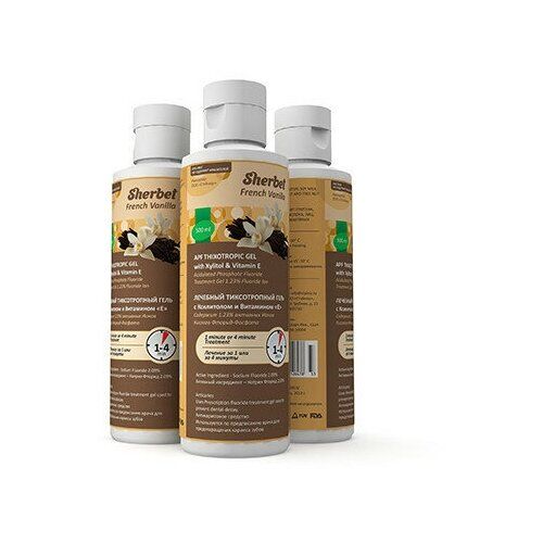 АПФ-составы чрезвычайно эффективны за счет закисленности, ионы фтора действуют быстрее, проникают глубже, запечатывая дентинные канальцы и снижая проницаемость эмали для раздражителей и патогенных микроорганизмов, вызывающих образование кариеса. Обладает свойством тиксотропности – предотвращает затекание материала в гортань. Sherbet уникален благодаря содержанию ксилита, который снижает адгезию бактерий к поверхности зуба, содержанию витамина Е, обеспечивающего эффект антиоксиданта и десенсибилизатора, а также не содержит алкоголь, глютен, соевое молоко, яйца, лесные, земляные орехи