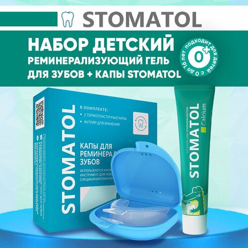 Набор для ухода за полостью рта детский STOMATOL - реминерализующий гель для зубов и Капы стоматологические для отбеливания зубов силиконовые. Детский гель для укрепления зубов Stomatol Calcium подходит для детей всех возрастов. Гель снижает риск появления кариеса, способствует здоровому формированию эмали, укрепляет ее, сокращает образование зубного налета. Натуральность 98,3%. Не содержит фтор. Реминерализирующий гель Стоматол абсолютно безопасен при проглатывании. Допустимо длительное регулярное применение. Активные компоненты: Дикальцийфосфат дигидрат — основной компонент для минерализации эмали временных и постоянных зубов за счет ионов кальция и фосфора. Гидроксиапатит способен проникать в мельчайшие трещинки эмали и «запечатывать» их, формирует на поверхности зубов защитный минеральный слой. Ксилит работает против кариеса, оказывая дополнительное антимикробное действие. Лактат кальция укрепляет эмаль, восполняя дефицит ионов кальция. Экстракты овса, ромашки, календулы, шалфея и тысячелистника дополнительно ухаживают и действуют успокаивающе на дёсны и слизистую полости рта. Капы для отбеливания зубов — это идеальное решение для тех, кто хочет вернуть своей улыбке яркость и здоровье в домашних условиях. Изготовленные из безопасного и качественного материала EVA, эти капы легко приобретают форму под ваш зубной ряд, обеспечивая максимальное проникновение отбеливающего или реминерализующего геля в эмаль. Они подходят как взрослым, так и детям с 6 лет, а также могут использоваться с брекетами и ретейнерами. Элайнер отлично подойдет для отбеливания зубов с отбеливающими гелями, а также для реминерализации и фторирования, обеспечивая удобство и эффективность в уходе за зубами. Выполнен из силиконового материала, термопластичен, обеспечивает индивидуальную посадку и комфортное использование, легко поддается формированию. Компактный контейнер не занимает много места, поэтому капы удобно брать с собой в поездки.