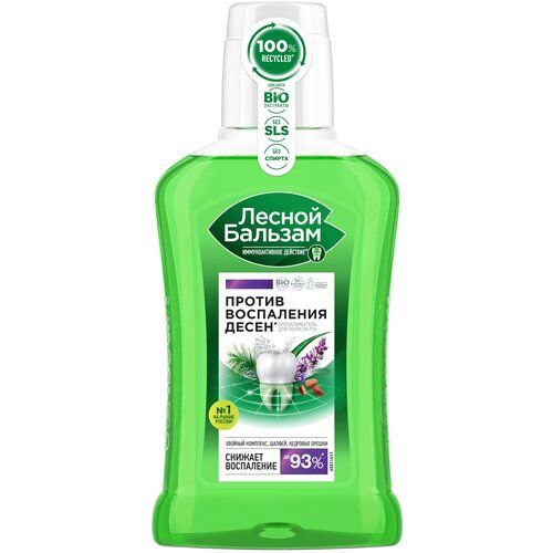 Профилактический ополаскиватель Лесной бальзам на отваре трав с шалфеем - эффективное средство для полоскания десен с выраженным противовоспалительным эффектом. Он обладает иммунноактивным действием и в 2 раза улучшает работу собственного иммунитета полости рта, снижая риск развития проблем с деснами*.