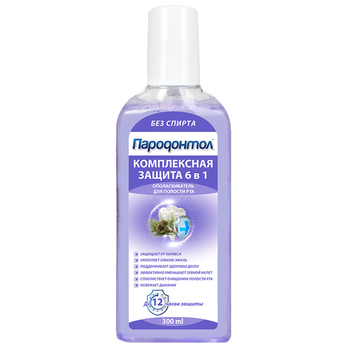 "Пародонтол Комплексная защита 6 в 1" - это ополаскиватель для полости рта, который обеспечивает комплексный уход и защиту в течение всего дня.