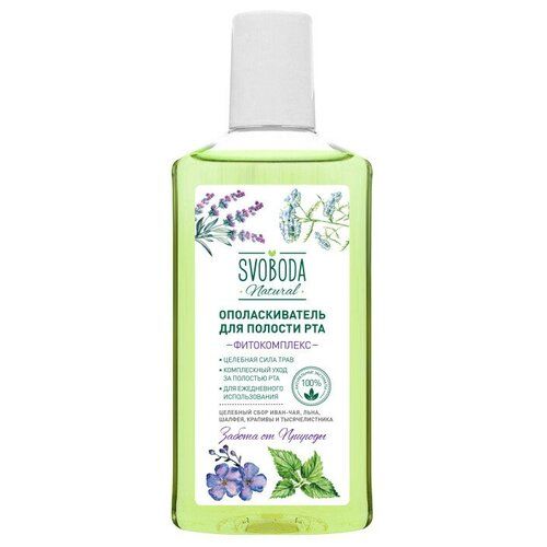 Свобода Ополаскиватель для полости рта Фитокомплекс 300 мл Ополаскиватель для полости рта svoboda фито-комплекс специально разработан для ухода за полостью рта как дополнительное средство, позволяющее обеспечить грамотный уход и качественный результат. Проникая в труднодоступные места полости рта, обеспечивает бережное очищение, дополняя профилактическое действие зубной пасты. Содержит специально подобранный комплекс целебных трав. Экстракты иван-чая, льна, шалфея, крапивы и тысячелистника заботятся о здоровье десен, укрепляя и питая их комплексом активных веществ. Без фтора. Без этилового спирта. Подходит для ирригатора. Состав: Aqua, Sorbitol, PEG-40 Hydrogenated Castor Oil, Urtica Dioica Еxtract, Salvia Officinalis Leaf Еxtract, Linum Usitatissimum Seed Extract, Achillea Millefolium Еxtract , Epilobium angustifolium Extract, Polysorbate 20, Propylene Glycol, Imidazolidinyl Urea, Disodium Phosphate, Disodium EDTA, Sodium Methylparaben, Sodium Saccharin, Citric Acid, Aroma, Limonene, C.I. 42090, C. I. 15985, C. I. 47005.