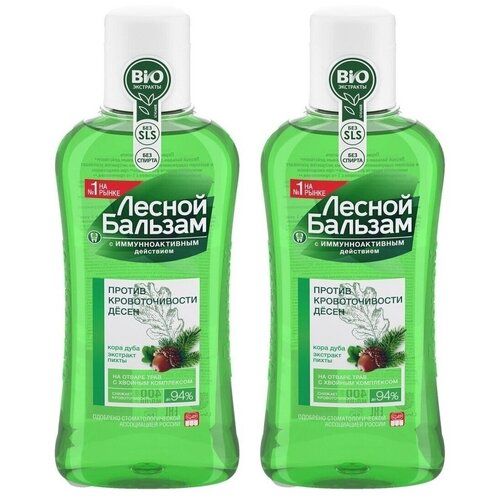 Профилактический ополаскиватель для полости рта Лесной бальзам c иммуноактивным действием помогает решить проблему кровоточивости десен и в 2 раза усиливает местный иммунитет полости рта, снижая риск развития проблем с деснамиx. Клинически-доказанный эффект: - С первого применения улучшает состояние десенx - До 94% снижает кровоточивость десен при регулярном использованииxx - В 5 раз снижает скорость образования налета на зубах, уменьшая бактериальную нагрузку на мягкие ткани полости ртаxx - не нарушает баланс микрофлоры полости рта Особенности состава: Формула ополаскивателя для полости рта при кровоточивости десен на 95% состоит из компонентов натурального происхождения, имеет насыщенный вкус хвойных масел в сочетании с мятной свежестью. Содержит хвойных комплекс (на основе экстрактов пихты, живицы, можжевельника) с отваром 5 целебных трав, экстрактом коры дуба и соком алоэ. Такой сбалансированный состав способствует укреплению кровеносных сосудов десен, улучшает кровообращение и питание мягких тканей. В комплекте 2 шт.