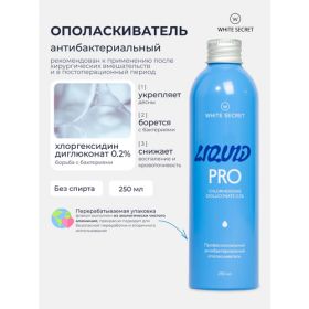 Антибактериальный ополаскиватель White Secret Liquid PRO с 0,2% хлоргексидина диглюконата. Рекомендован к применению после хирургических вмешательств и в послеоперационный период.