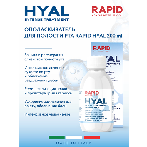 Линейка RAPID HYAL – это специально разработанные стоматологами продукты для защиты и регенерации слизистой оболочки полости рта, интенсивного лечения сухости, облегчения раздражения десен, ускорения заживления язв, реминерализации эмали и предотвращения кариеса. Ополаскиватель RAPID HYAL - специально средство, предназначенное для эффективного ухода за полостью рта, рекомендован людям, имеющим проблему сухости во рту. Он помогает предотвратить, облегчить и лечить оральный мукозит, а также способствует избежанию тяжелых осложнений, уменьшению болевого синдрома и облегчению процесса приема пищи. С первого применения улучшает состояние десен, снижает скорость образования бактериального налета, оказывает противовоспалительное, заживляющее и противомикробное действие, освежает дыхание, обладает приятным вкусом. RAPID HYAL является идеальным решением для пользователей элайнеров, обеспечивая максимальную эффективность и комфорт. Благодаря высокой вязкости, он покрывает ткани полости рта, обволакивает зубы, проникая в труднодоступные места, обеспечивая дополнительную смазку и комфорт, ускоряет процесс адаптации мягких тканей к наличию элайнеров в полости рта. Уникальный состав ополаскивателя включает ультрамолекулярную гиалуроновую кислоту, которая действует как антиоксидант, обеспечивая защиту тканей от повреждения свободными радикалами и способствуя заживлению ран. Кополимер ВП/ВА образует защитный барьер на слизистой оболочке полости рта, а аллантоин способствует быстрой регенерации клеток и обладает обезболивающим действием. В составе присутствует комплекс органических кислот и фтор 500 ppm F для реминерализации эмали, предотвращения образовывания зубного камня. Состав RAPID HYAL абсолютно безопасен, без побочных эффектов. Имеет мягкую формулу, приятный вкус, хорошо адаптируется к самой чувствительной слизистой оболочке полости рта. Подходит для взрослых и детей 7+, беременных, людей, проходящих химиотерапию и лучевую терапию, с сахарным диабетом I и II типа.