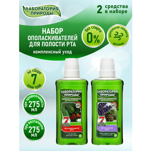 В набор входят: Лаборатория природы Ополаскиватель с маслом кедровых орешков и экстрактом шалфея 275 мл, Лаборатория природы Ополаскиватель с экстрактами коры дуба и пихты 275 мл. Ополаскиватель с маслом кедровых орешков и экстрактом шалфея обеспечивает профилактику воспаления десен, замедляет скорость образования зубного налета, защищает от кариеса, придает длительную свежесть дыханию. Масло кедровых орешков стимулирует заживление тканей. Эфирное масло шалфея снимает воспаление дёсен. Ополаскиватель с экстрактами коры дуба и пихты рекомендован для профилактики кровоточивости и воспаления десен, снижает скорость образования зубного налета, защищает от кариеса, придает длительную свежесть дыханию. Экстракт коры дуба снимает воспаление, укрепляет дёсны. Экстракт пихты устраняет кровоточивость, стимулирует заживление тканей, препятствует развитию патогенных бактерий в полости рта. Ополаскиватели содержат фтористый натрий.