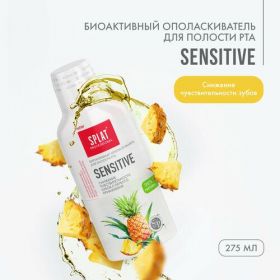 Ополаскиватель для рта Splat Sensitive обеспечивает комплексный уход за полостью рта. Снижение чувствительности зубов с первого применения. Ополаскиватель для полости рта: - Снижает чувствительность зубов - Восстанавливает эмаль - Обеспечивает длительную свежесть дыхания Натуральный ополаскиватель - эффективное профилактическое средство для ежедневного использования. Обогащенный магнием и цинком гидроксиапатит и лактат кальция способствуют реминерализации эмали. Натуральные масла лимона и аниса обладают противовоспалительным действием. Ионы калия способствуют снижению чувствительности зубов за счет подавления активности сенсорных нервных окончаний. Средство для ухода за полостью рта. Способ применения: Наполните колпачок ополаскивателем. Не разбавляйте. Полощите в течение 1 минуты, затем выплюньте. Не глотайте. Для здоровья десен и зубов используйте ополаскиватель регулярно после приема пищи или чистки зубов пастой SPLAT Professional Sensitive.