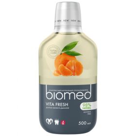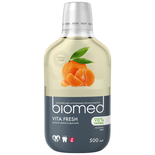 Антибактериальный ополаскиватель для полости рта для свежести дыхания BIOMED VITAFRESH Цитрус, 500 мл. Длительная свежесть дыхания. Защита от бактерий благодаря ионам цинка, экстрактам березы и подорожника, и экстракту листьев стевии. - 98% natural. - Лактат кальция, L-аргинин, цинк, медь и магний укрепляют и восстанавливают зубную эмаль - Фермент бромелаин из экстракта ананаса обеспечивает расщепление белкового налета - Экстракты подорожника и листьев березы – антикариесный и противовоспалительный эффекты - Ароматы мандарина и лимона дарят душевное равновесие - Натуральный ментол обеспечивает длительную свежесть дыхания..