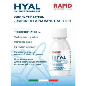 Линейка RAPID HYAL – это специально разработанные стоматологами продукты для защиты и регенерации слизистой оболочки полости рта, интенсивного лечения сухости, облегчения раздражения десен, ускорения заживления язв, реминерализации эмали и предотвращения кариеса. Ополаскиватель RAPID HYAL - специально средство, предназначенное для эффективного ухода за полостью рта, рекомендован людям, имеющим проблему сухости во рту. Он помогает предотвратить, облегчить и лечить оральный мукозит, а также способствует избежанию тяжелых осложнений, уменьшению болевого синдрома и облегчению процесса приема пищи. С первого применения улучшает состояние десен, снижает скорость образования бактериального налета, оказывает противовоспалительное, заживляющее и противомикробное действие, освежает дыхание, обладает приятным вкусом. RAPID HYAL является идеальным решением для пользователей элайнеров, обеспечивая максимальную эффективность и комфорт. Благодаря высокой вязкости, он покрывает ткани полости рта, обволакивает зубы, проникая в труднодоступные места, обеспечивая дополнительную смазку и комфорт, ускоряет процесс адаптации мягких тканей к наличию элайнеров в полости рта. Уникальный состав ополаскивателя включает ультрамолекулярную гиалуроновую кислоту, которая действует как антиоксидант, обеспечивая защиту тканей от повреждения свободными радикалами и способствуя заживлению ран. Кополимер ВП/ВА образует защитный барьер на слизистой оболочке полости рта, а аллантоин способствует быстрой регенерации клеток и обладает обезболивающим действием. В составе присутствует комплекс органических кислот и фтор 500 ppm F для реминерализации эмали, предотвращения образовывания зубного камня. Состав RAPID HYAL абсолютно безопасен, без побочных эффектов. Имеет мягкую формулу, приятный вкус, хорошо адаптируется к самой чувствительной слизистой оболочке полости рта. Подходит для взрослых и детей 7+, беременных, людей, проходящих химиотерапию и лучевую терапию, с сахарным диабетом I и II типа.
