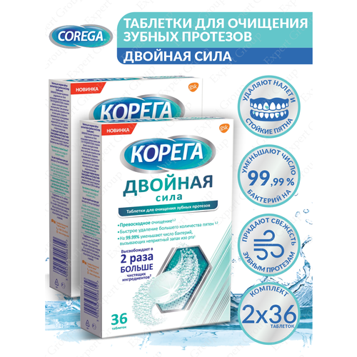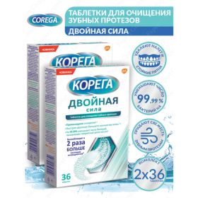 Комплект Корега Двойная сила Таблетки для очистки зубных протезов 36 шт. в упак. х 2 шт. Новые таблетки для очищения зубных протезов Корега Двойная Сила - это самая мощная формула таблеток от Корега. Они содержат в 2 раза больше чистящих ингредиентов, чем обычные таблетки, обеспечивая быстрое и превосходное очищение, что помогает продлить срок использования протеза.