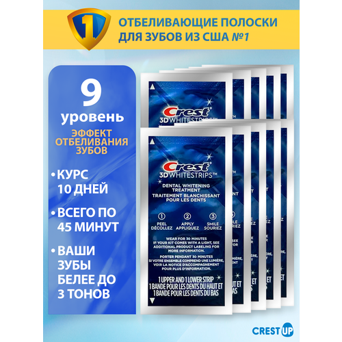Комплект включает в себя 10 пакетиков, это половина от полного курса «Crest 3D Whitestrips Professional Effects» – Эффект отбеливания зубов до 3 тонов, а уровень отбеливания 9.