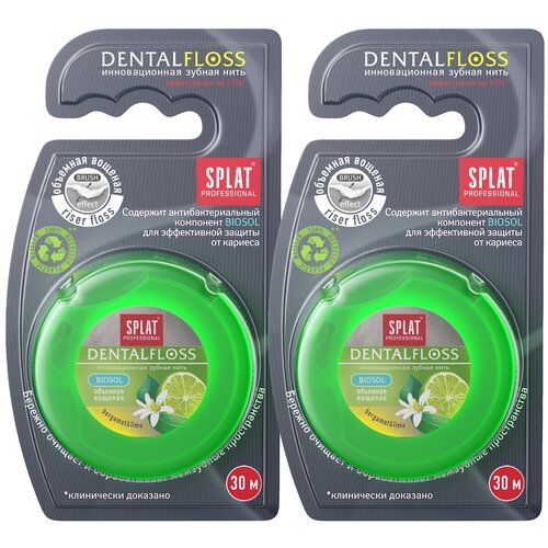 Объемная вощеная зубная нить SPLAT Dental Floss для ухода за полостью рта с ароматом бергамота и лайма тщательно очищает боковые поверхности зубов и межзубные промежутки. Антибактериальный компонент Biosol защищает зубы от бактерий. Волокна нити для чистки зубов распушаются по технологии RiserFloss во время использования и бережно обрабатывают всю поверхность зуба, даже скрытую под десной. Клинически доказанная эффективность Dental Floss: - Образование налета уменьшается на 69%. - Кровоточивость десен снижается на 50%. Тонизирующие эфирные масла бергамота и лайма оставляют легкое лимонное послевкусие, надолго освежая дыхание. Длина флосса - целых 30 метров С заботой о природе мы упаковали продукт в блистер из 100% переработанного пластика.