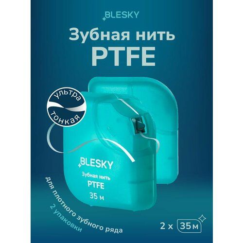 Набор из 2 упаковок. Плоская тефлоновая нить BLESKY® PTFE длиной 35 метров. Эффективно удаляет налёт и остатки пищи в труднодоступных межзубных промежутках, куда не проникает зубная щётка. Гладкая нить PTFE идеальна для плотного зубного ряда, она легко проходит через плотные контактные точки. Тефлоновое моноволокно 1000D устойчиво к разрыву и не расслаивается даже при интенсивном использовании. Деликатно очищает у десны, снижая риск травм и делая процесс чистки комфортным. Между зубами эмаль тоньше, а налет скапливается быстрее — это самые уязвимые участки для кариеса. Защита уязвимых зон на 360 градусов. Зубная нить сертифицирована: прошла все клинические испытания, доказала свою эффективность и безопасность.
