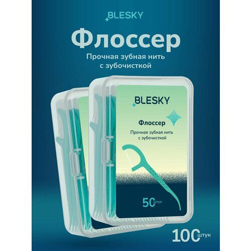 Набор из 2 упаковок. Флоссер BLESKY – это прочная зубная нить с зубочисткой, в пластиковом кейсе 50 штук. Эффективно удаляет налёт и остатки пищи в труднодоступных межзубных промежутках, куда не проникает зубная щётка. Нить UHMWPE 400D/200 устойчива к разрыву и не расслаивается даже при интенсивном использовании. Тонкая зубная нить обеспечивает лёгкое скольжение даже через плотные контактные точки между зубами, что делает её универсальной для всех типов зубов, минимизируя риск травмирования дёсен. Зубочистка всегда под рукой: удобная зубочистка позволяет легко удалять остатки пищи между зубами. Специально закруглённая зубочистка не травмирует дёсны и всё так же эффективна. 2 в 1 – без лишних усилий. Флоссер сразу готов к применению в отличии от обычной нити в намотке. Защита уязвимых зон на 360 градусов. Между зубами эмаль тоньше, а налет скапливается быстрее — это самые уязвимые участки для кариеса. Флоссеры сертифицированы и прошли все клинические испытания, доказали свою эффективность и безопасность.