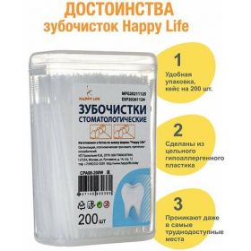 НАЙТИ ВЫГОДНЕЕ - Зубочистки Happy Life, стоматологические, двусторонние, белый пластик, 200шт