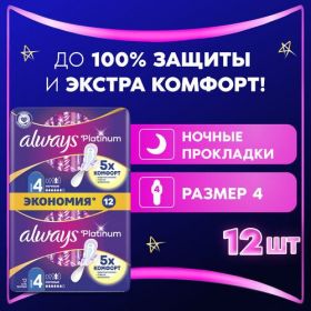 НАЙТИ ВЫГОДНЕЕ - Женские гигиенические прокладки с крылышками Always Platinum Ночные, размер 4, 12шт.