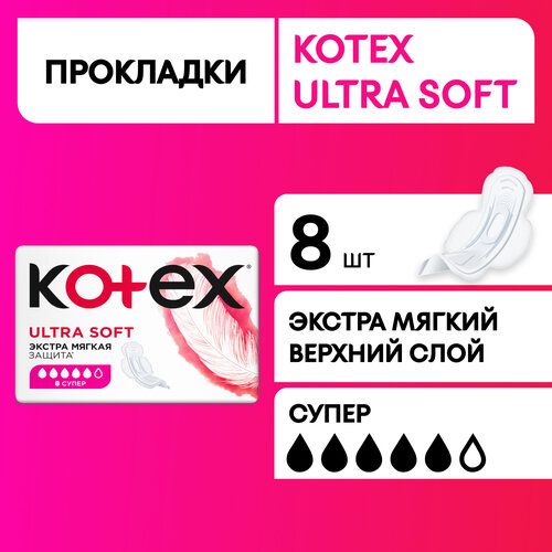 Новые прокладки Kotex Ultra Soft Super (Котекс Ультра Мягкие Супер для умеренных выделений) с невероятно мягкой как хлопок поверхностью дарят тебе комфорт и уверенность на все 100 5 капель (5 из 6) Преимущества: • Уникальная система быстрого впитывания с инновационным центром Fast Absorb позволяет жидкости впитываться за секунды и равномерно распределяться внутри прокладки, что способствует надежной защите и комфорту • Система барьерчиков и канальцев сохранит всю жидкость внутри прокладки • «Дышащая» и мягкая как хлопок поверхность для максимального комфорта и сухости кожи • Мягкие крылышки, надежно крепятся к белью и не натирают кожу