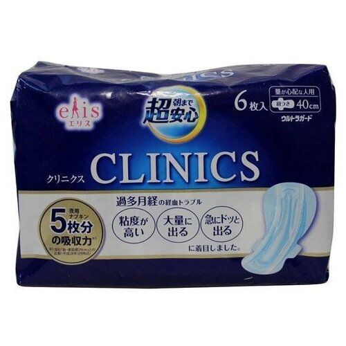 Elis Ультравпитывающие прокладки Clinics с крылышками (Супер++) 40см, 6шт Прокладки толщиной 0,4 см, созданы для очень обильных выделений, в т. ч. отличающихся внезапностью и высокой вязкостью, в т. ч. при меноррагии. Впитывают в 5 раз сильнее классических ночных прокладок Elis (29 см.). В прокладках применена инновационная система впитывания скорость+мощность. Впитывающий слой состоит из быстро впитывающих волокон, которые мгновенно всасывают жидкость, и полимеров, которые продолжают поглощать жидкость в течение многих часов. Шёлковое дышащее покрытие продолжительное время сохраняет ощущение сухости, при этом удерживает влагу внутри. Прокладка имеет особо сложный рельеф с углублениями, защищающими от протекания в местах максимального скопления жидкости, а также влагонепроницаемые большие боковые оборки (клапаны) для 100 % защиты. Прокладки изготовлены из современного дышащего материала, они обеспечат вам комфорт и ощущение свежести. Снабжены крылышками.