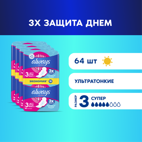 Тройная защита от Always — не соглашайтесь на меньшее: в Always Ultra «Супер» (Размер 3) с крылышками используется новейшая технология для создания многофункциональной гигиенической прокладки с 3 элементами защиты. Система «Сразу сухо» впитывает влагу за считаные секунды и не дает ей соприкасаться с кожей. Технология «Защитные барьеры» удерживает жидкость, предотвращая протекания. Технология «Блок запаха» нейтрализует неприятные запахи, придавая ощущение свежести и чистоты во время менструации. С Always Ultra вы можете чувствовать себя уверенно весь день. Тройная защита от Always — не соглашайтесь на меньшее.